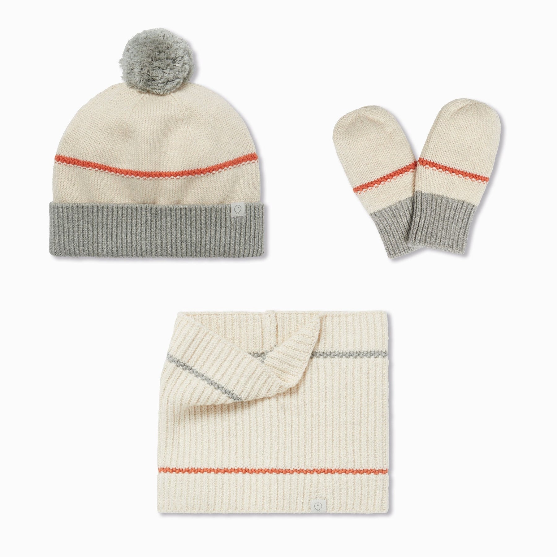 Wrap them up for chilly adventures in our organic cotton Knitted Beanie Hat, Snood & Mittens Set. The beanie style hat has a ribbed trim for extra warmth and adorable bobble. The hat and mittens are finished with organic cotton jersey lining.