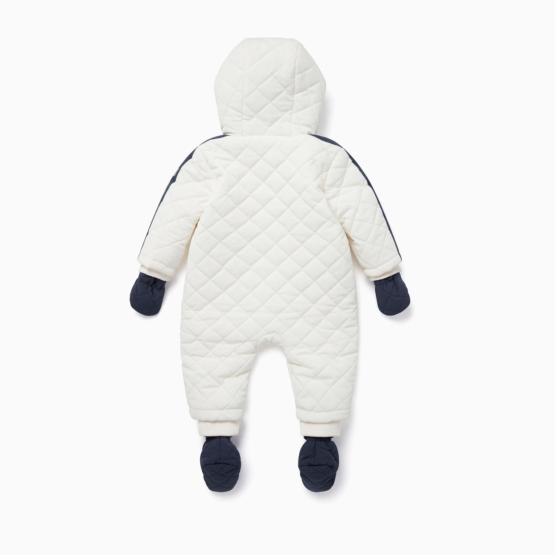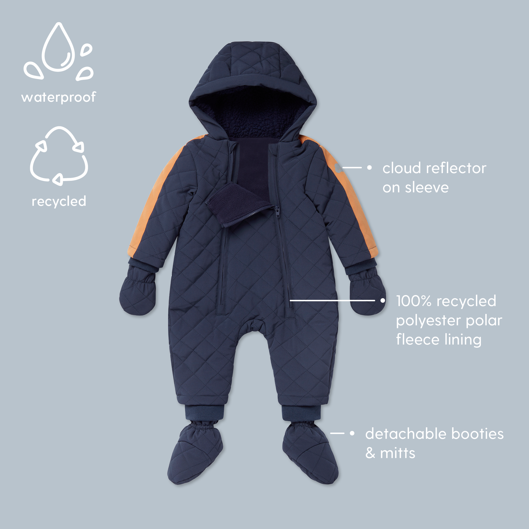 Chilly days are no match for our Recycled Quilted Snowsuit. This padded suit is made from recycled plastic bottles with a toasty fleece lining. A fluffy sherpa lining in the hood adds extra warmth. The snowsuit fastens with a handy two-way zip for quick dressing.