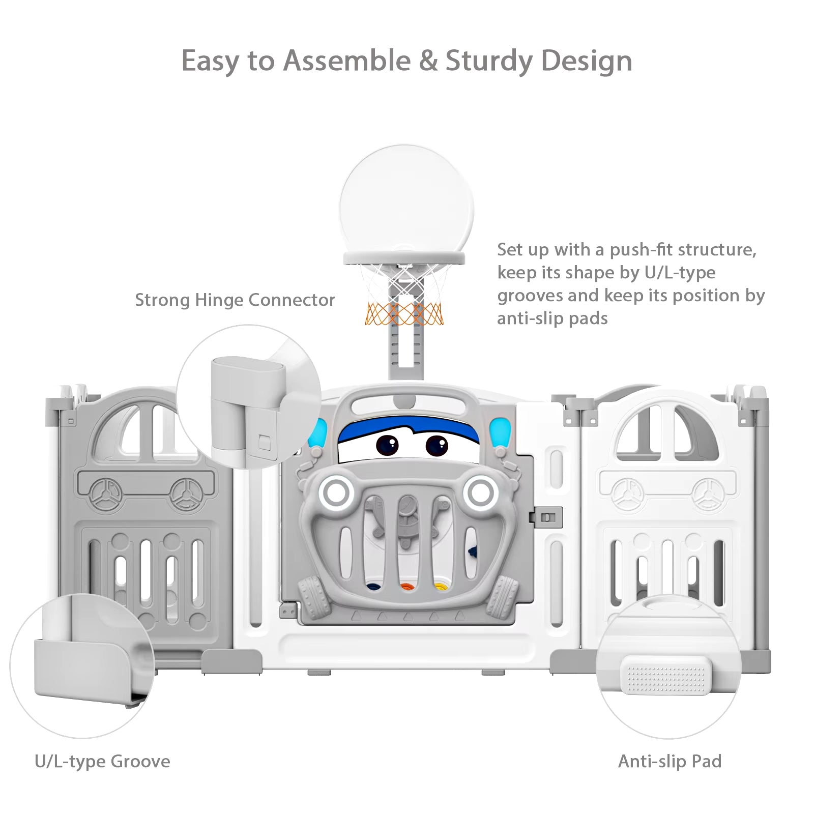 Foldable Baby Playpen with Basketball Hoop & 50Pcs Coloured Pit Balls without Play Mat, Toddler and Baby Playpen fence, 14-Panel Features: