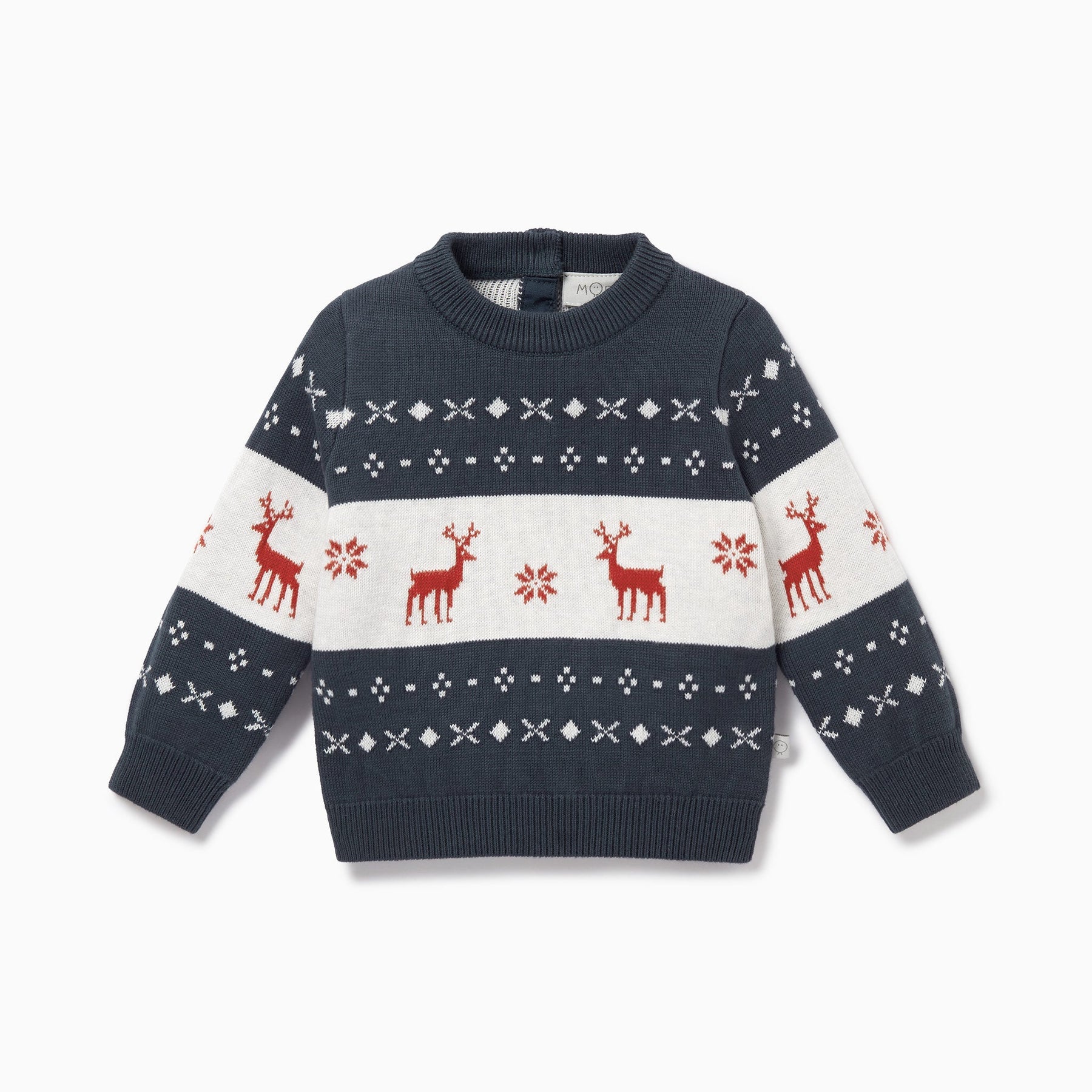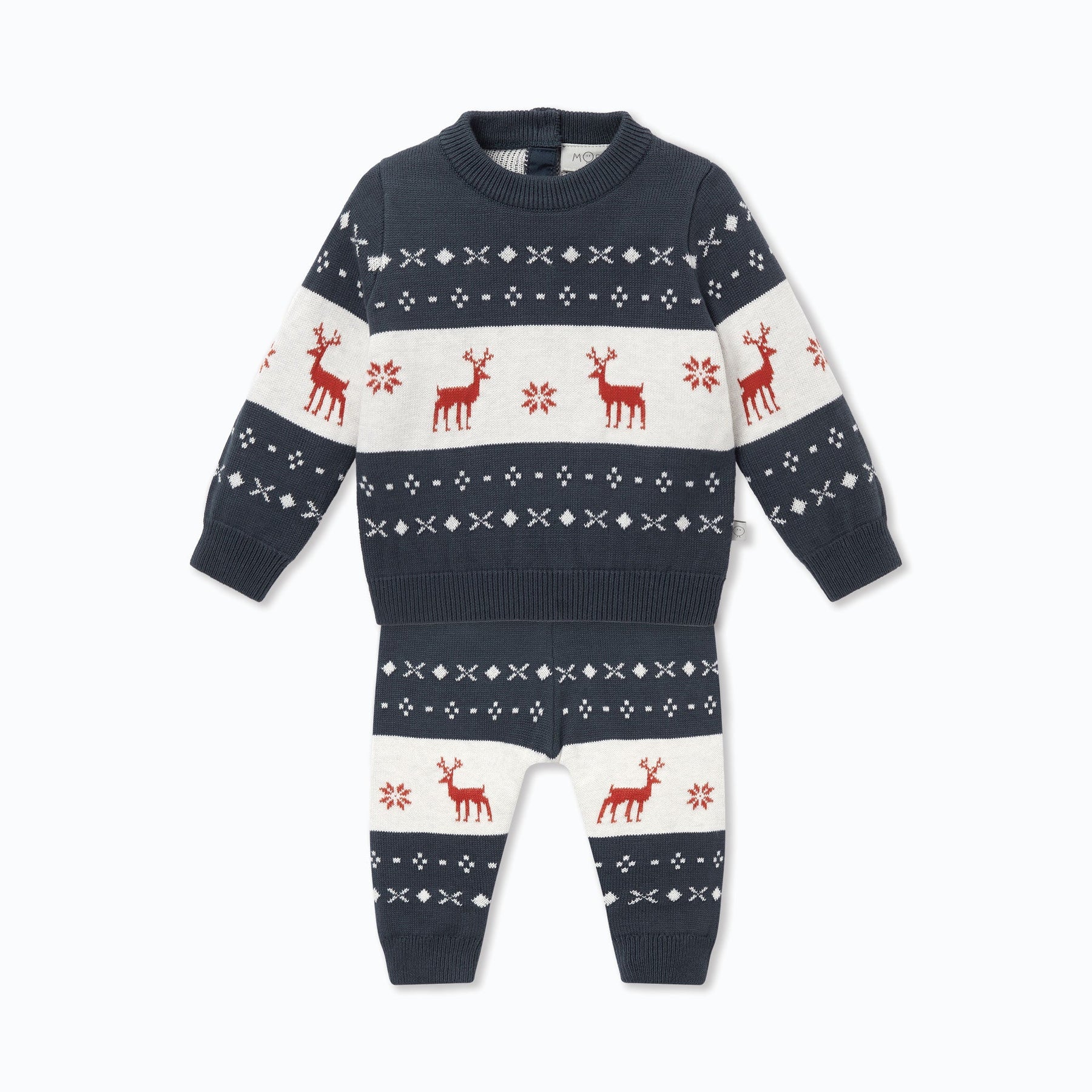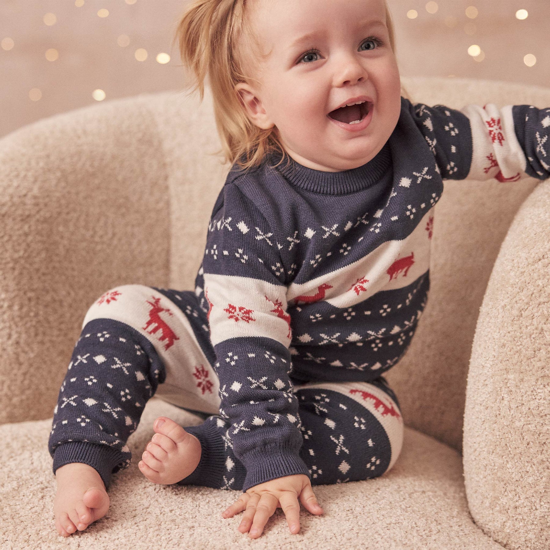 Our Knitted Reindeer Jumper & Joggers Outfit is perfect for the holiday season. Both pieces are made from soft & cosy knitted organic cotton and printed with a fun reindeer motif. The bottoms have an elasticated waistband for comfort. Discover supersoft baby christmas outfit for the night before too.
